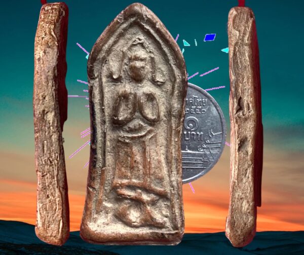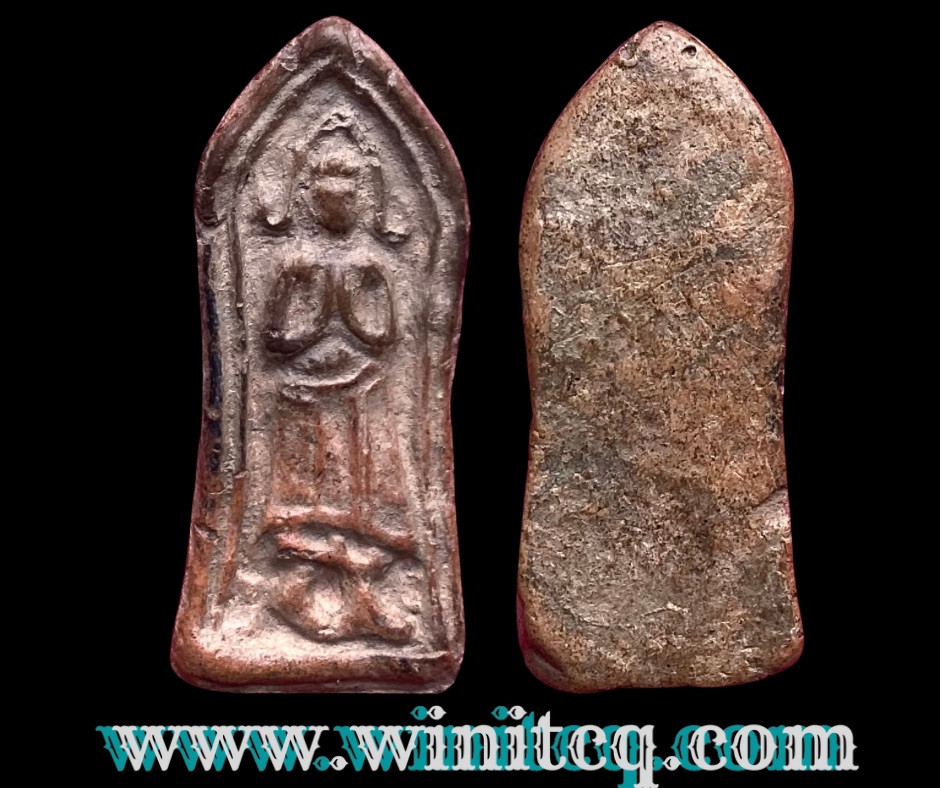พระกำแพงปางตั้งสัตยาธิฐาน (กรุเจดีย์พง) วัดบาง กำแพงเพชร พระชุดนี้ชาวบ้านบอกว่าแตกกรุออกมาตอนเจดีย์เก่าพังทลายมีมากมายทั้งพิมพ์ใหญ่ – เล็ก (เนื้อดิน-เนื้อชิน) เป็นวัดเก่าโบราณน่าจะชื่อ “วัดกุฏิพง” ( ป่าต้นพง) ต่อมามีวัดสร้างใหม่ในบริเวณวัดเก่าชื่อ “วัดบาง” เมื่อเจดีย์เก่าพังทางวัดก็รวบรวมมาบรรจุใหม่ในวัดบาง บางส่วนก็เลยวัดกลับมาบรรจุที่บ้าน องค์นี้เป็นพิมพ์เล็กเนื้อดินเก่าแกร่ง ขนาด 2.0 x 4.5 ซม. 800.- บาทครับ.