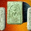 พระพิมพ์สมเด็จคะแนนปี 2502 หลวงตาพัน วัดใหม่อมตรส กทม. หลวงตาพันท่านเป็นพระลูกวัด อาศัยอยู่ในโบสถ์วัดใหม่อมตรส พบเห็นพระหักชำรุด ที่พวกมาแอบลักตกพระหักก็เอาวางไว้แถวเจดีย์ไม่เอาไปด้วยพอท่านมาเจอก็นำมาเก็บไว้เพราะความเสียดาย ปี 2500 ทางวัดเปิดกรุอย่างเป็นทางการ ท่านก็รวบรวมพระแตกหักทั้งหมดมาตำบดผสมดินก้นกรุและผงเก่าที่ท่านมีผสมน้ำมันตังอิ้วสร้างพระขึ้นใหม่เมื่อปี 2502 เรื่อย ๆ มาเพื่อแจกลูกศิษย์ลูกหาที่มากราบท่าน องค์นี้เป็นอีกหนึ่งพิมพ์คะแนนของท่าน แม่พิมพ์ทำด้วยยางทำฟันจึงทำให้พระของตื้นขาดความสวยงาม ขนาด 1.5 x 2.0 ซม. 700.- บาทครับ.