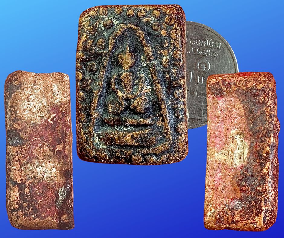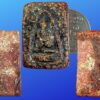 พระเนื้อดินเผาหลังจาร หลวงปู่ทอง วัดราชโยธา กทม. พระอรหันเจ็ดแผ่นดิน ท่านเกิดปี 2363 (ปลาย ร.2) มรณภาพปี 2480 (ร.8) หลวงปู่ทองท่านเป็นศิษย์ร่วมอาจารย์เดียวกับสมเด็จ ฯ (โต) วัดระฆัง ฯ คือหลวงปู่แสง วัดมณีชลขันธ์ แต่เป็นศิษย์รุ่นน้อง ลูกศิษย์ของหลวงปู่ทองและดังสะท้านเมืองไทยเช่น.- หลวงพ่อคง วัดบางกะพ้อม หลวงพ่อแช่ม วัดฉลอง หลวงปู่เอี่ยม วัดหนัง หลวงปู่เผือก วัดกิ่งแก้ว หลวงพ่อพัก วัดบึงทองหลาง หลวงพ่อเผือก วัดลาดพร้าว ประวัติกล่าวว่าถ่ายรูปท่านไม่ติด มีรูปเดียวที่ขออนุญาติท่านได้ เหรียญท่านปลุกเศกรุ่นเดียวปี 2480 (แก้ว คำวิบูลย์ ครั้งที่ 1, อาจารย์ทอง วัดราชโยธา อายุ 117 ) พระเนื้อดินเผาลงรักล่องชาดที่นำมาเสนอองค์นี้ปางสมาธิ์ฐานสองชั้นในซุ้มใบโพธิ์จุดครอบแก้วหลังจาร “ยันต์ธงชัย” ปี 2470 พิมพ์นี้และยันต์นี้พบน้อยกว่าถึงน้อยที่สุด ยากจะพบเห็น ขนาด 1.0 x 2.0 x 2.5 ซม 800.- บาทครับ.