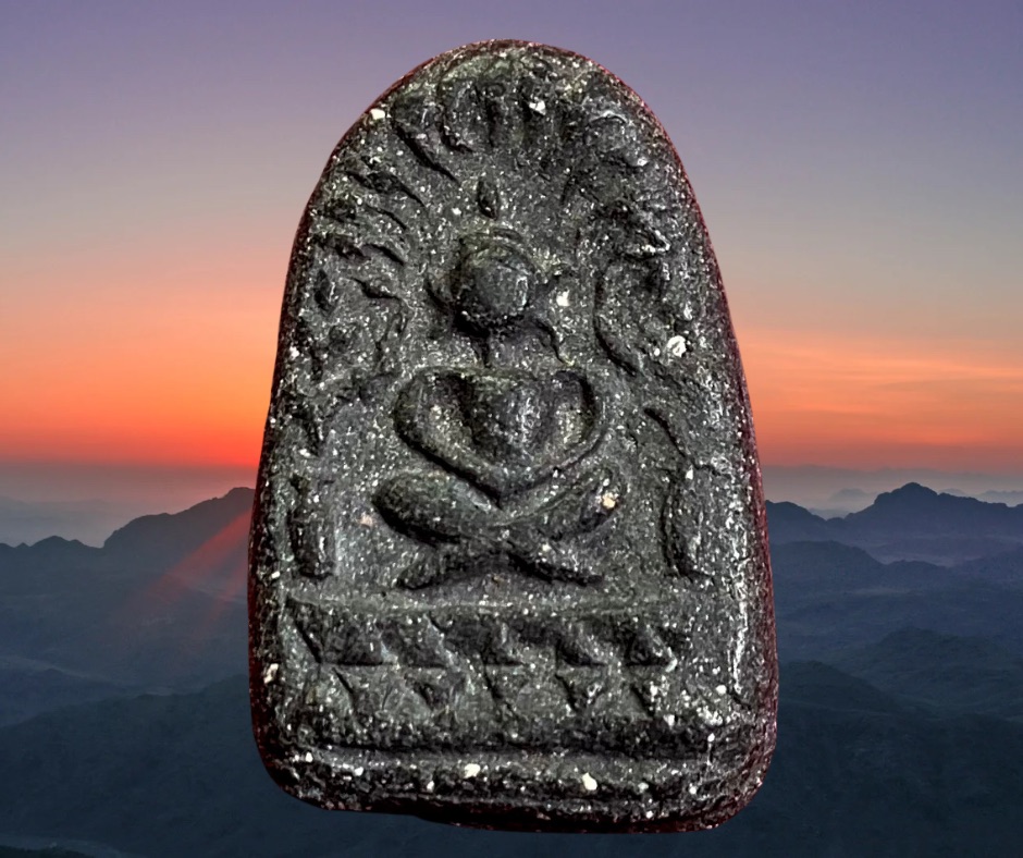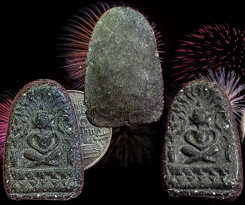 พระซุ้มเถาวัลย์แจกันคู่เนื้อผงพุทธคุณผสมผงใบลานเผา หลวงพ่อพริ้ง วัดบางประกอก กทม. เป็นพระที่ท่านสร้างยุคแรก ๆ ประมาณปี 2460 ลงมา พระพิมพ์เล็บมือของท่านแยกเป็นพิมพ์ย่อยได้อีกหลายพิมพ์มาก องค์นี้ที่นำมาเสนอผู้สะสมเขาเรียกกันว่า “พระซุ้มรัศมีเถาวัลย์แจกันคู่” ฟังดูเพราะดี เป็นพิมพ์ที่พบเจอน้อยมาก ขนาด 2 x 3 ซม. 800.- บาทครับ.